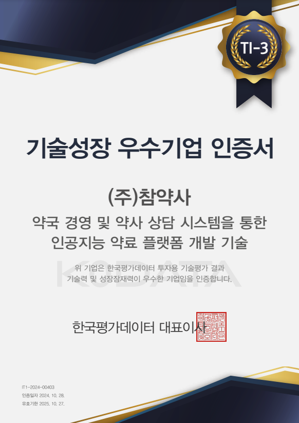 ‘약국체인, 약사플랫폼 기업’ 참약사(대표 김병주)가 한국평가데이터(KoDATA) 투자용 기술평가등급(TI등급)의 상위 3단계에 해당하는 'TI-3'등급을 획득했다.