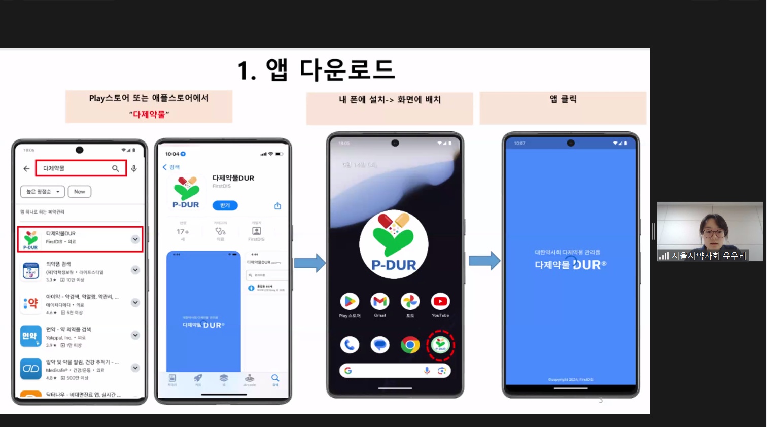이번 교육은 유우리 지역사회약료이사가 직접 진행했으며, 다제약물 상담을 위한 상담계획 수립에서부터 다제약물DUR(P-DUR)앱 사용법, 상담 후 상담결과 입력 및 상담료 청구 방법까지 실무적인 프로세스를 상세히 설명했다. 이번 교육에는 서울시약사회 다제약물관리사업 자문약사 총 121명이 접속해 참여했다.