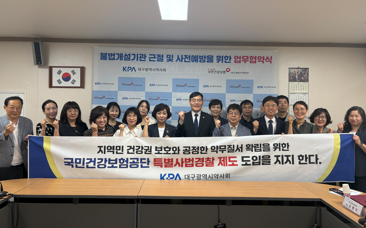 대구시약사회와 국민건강보험공단 대구경북지역본부는 앞으로 상호 신뢰와 협조를 바탕으로 불법개설기관 근절을 위한 정보공유 및 사전예방을 위한 다양한 노력을 공동 추진하기로 했다.
