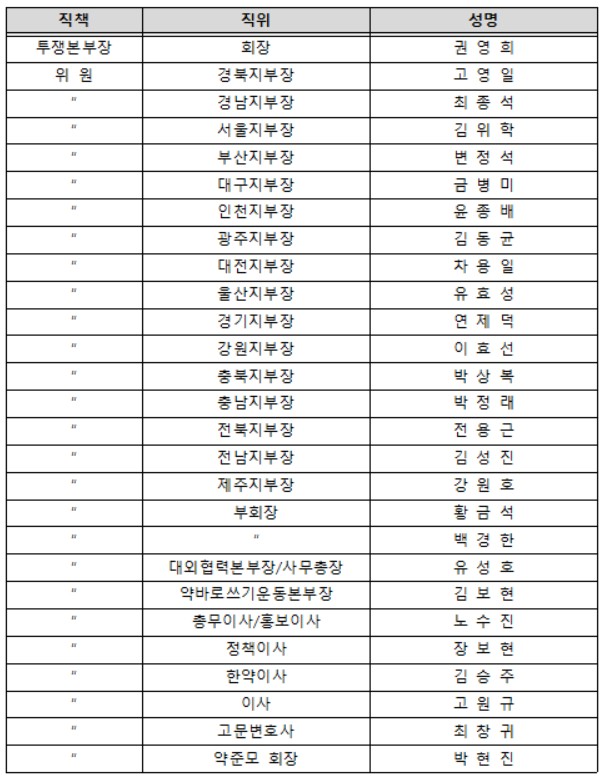 권영희 회장을 투쟁본부장으로 전국 시도지부장과 기존 TF 위원, 약준모 회장 등 총 27인[명단 첨부]으로 구성되며, 투쟁 전략 및 정책 마련, 회원 결집 및 대관업무 등을 총괄하는 한약사 문제와 관련한 최고 의사결정 기구로서 역할하게 된다.