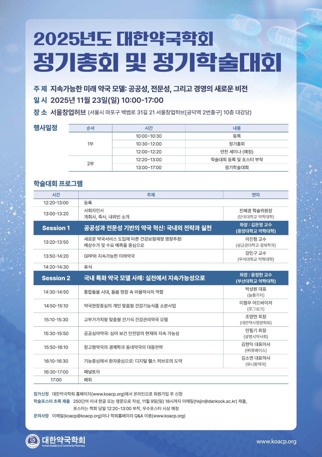대한약국학회(회장 주상훈)는 오는 11월 23일 서울 마포구 서울창업허브 대강당에서 ‘지속가능한 미래 약국 모델: 공공성, 전문성, 그리고 경영의 새로운 비전’을 주제로 2025년도 정기총회 및 추계학술대회를 개최한다.