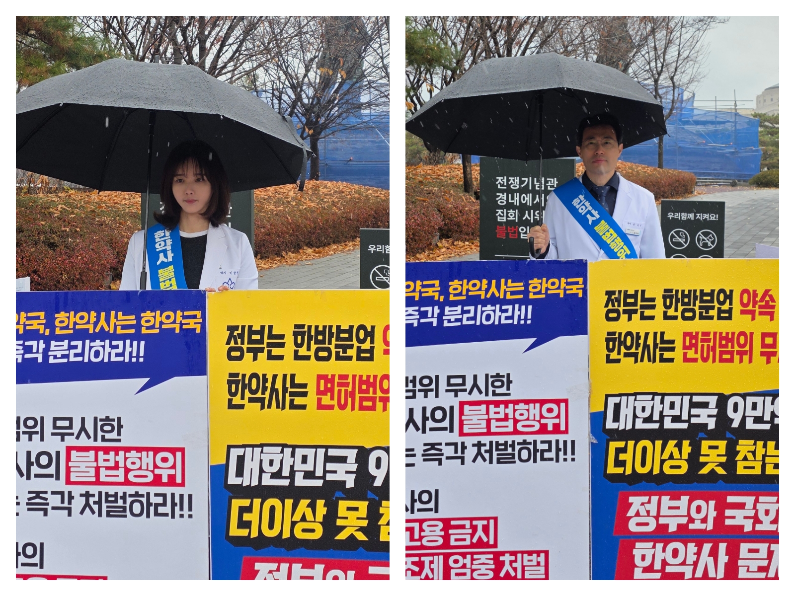 두 약사회장은 비가 내리는 궂은 날씨에도 정부의 한약사 문제 해결을 촉구하기 위해 현장을 찾았다.