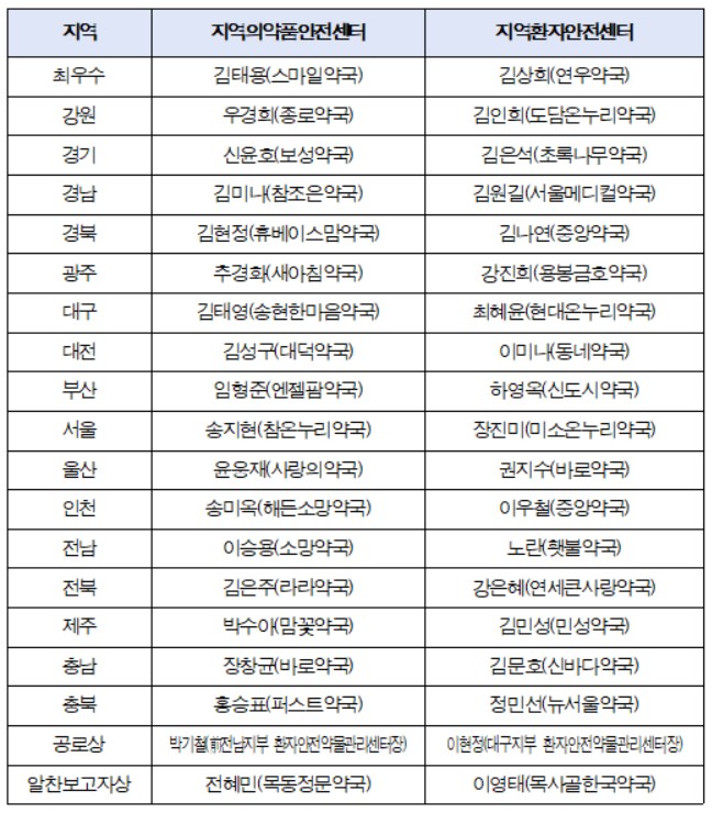 또 최우수 ‘알찬보고자상’은 목동정문약국(서울 양천구)의 전혜민 약사와 목사골한국약국(전남 나주시)의 이영태 약사가 각각 수상했다. 해당 상은 보고 내용이 충실한 월별 ‘알찬보고자’ 수상자 중에서 의약품 부작용 및 환자안전사고 부문 각 한 명에게 주어진다.