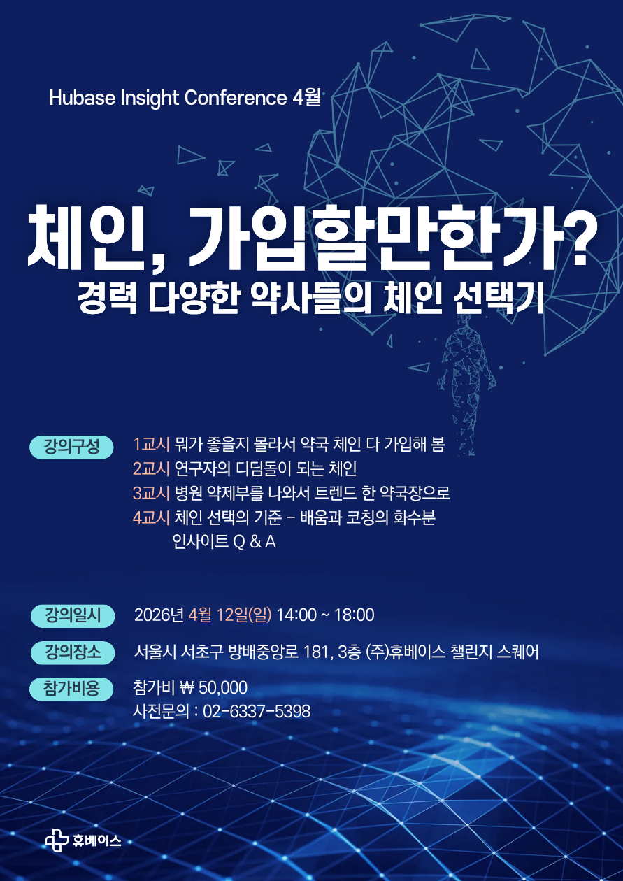 약국체인 휴베이스(대표 김현익)가 개국 및 체인 가입을 고민하는 약사들을 위해 ‘체인 선택의 기준’을 주제로 오는 4월 12일 ‘휴베이스 인사이트 컨퍼런스(HIC, Hubase Insight Conference)’를 개최한다.