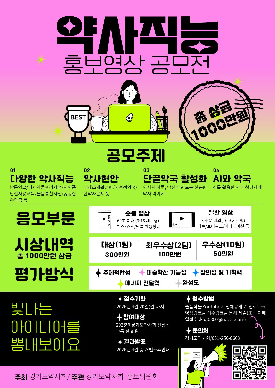 경기도약사회(회장 연제덕) 홍보위원회(부회장 권태혁, 위원장 탁경옥)는 국민들에게 약사 직능의 의미와 가치를 효과적으로 알리고 사회적 인식을 제고하기 위해 ‘2026년 약사직능 홍보영상 공모전’을 개최한다고 밝혔다.