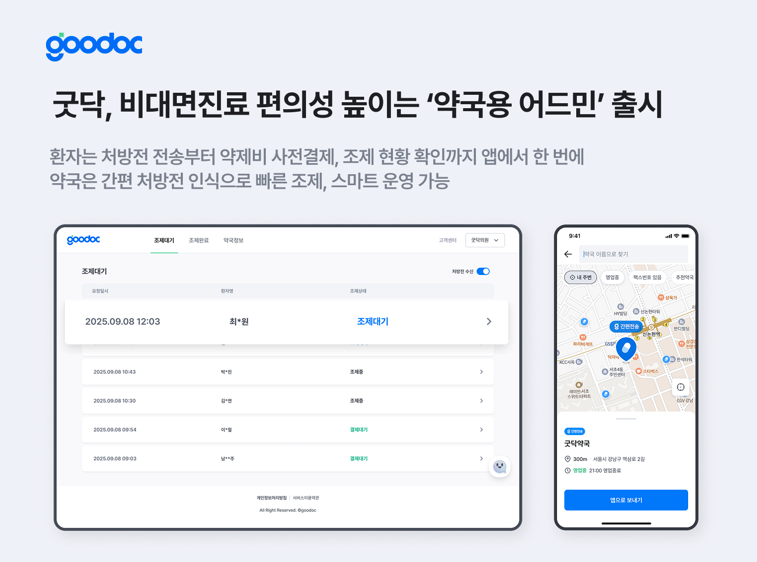병원 진료 접수·예약 및 비대면 진료 플랫폼 굿닥(대표 장영주)은 비대면진료 전체 이용 과정의 편의성을 높이는 ‘약국용 어드민’을 출시했다고 8일 밝혔다.