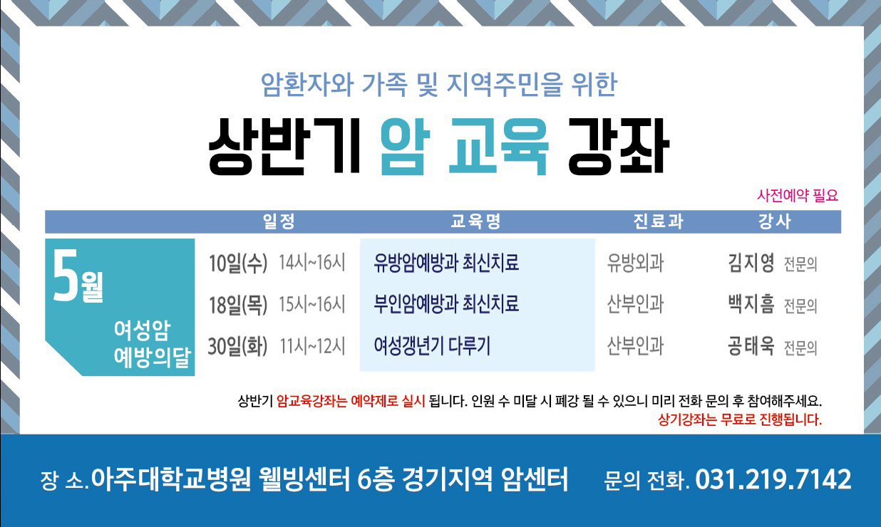 아주대병원 지역암센터가 오는 5월 10일부터 '암환자와 가족, 지역주민을 위한 2017년 5월 암 교육강좌'를 개최한다.