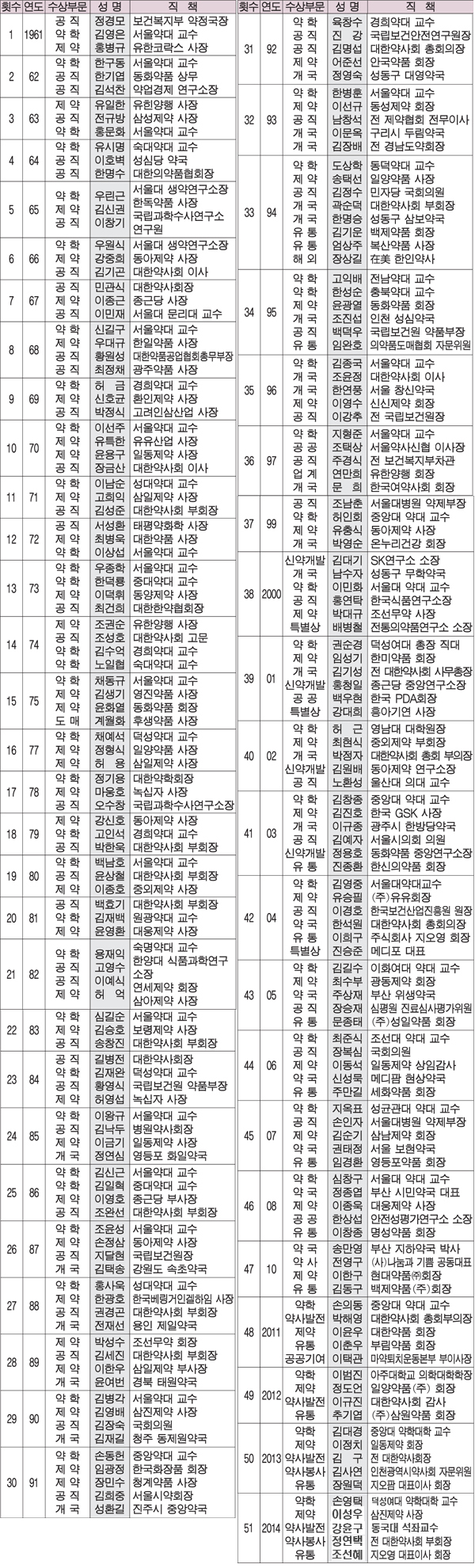 역대 동암 약의상 수상자 명단