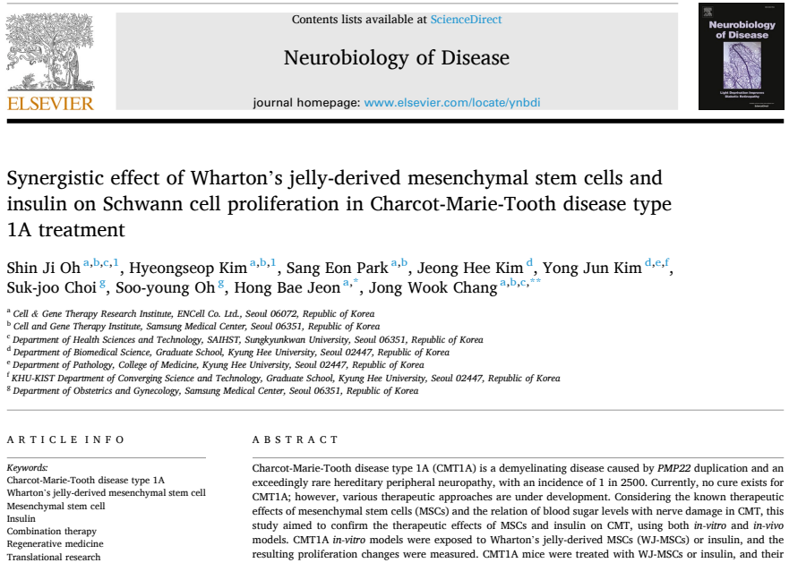 첨단바이오의약품 신약개발 전문기업 이엔셀은 최근 샤르코-마리-투스병 1A형의 새로운 치료 방법에 대한 논문이 신경과학 분야의 권위 있는 학술지 ‘Neurobiology of Disease’에 게재됐다고 11일 밝혔다.