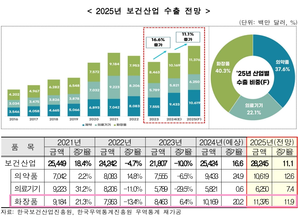 10일 한국보건산업진흥원(이하 진흥원)이 발표한 '보건산업 수출 2024년 동향 및 2025년 전망'에 따르면 올해 보건산업 수출은 기초화장품 및 바이오의약품 수출 증가의 영향으로 전년 대비 16.6% 늘어난 254억 달러를 기록할 것으로 전망된다. 이는 2021년 254억 달러 다음으로 높은 수출액이다.