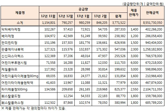 편의점 판매가격으로 공급량이 높은 품목들의 대략적인 매출액을 추정해 보면 타이레놀500mg은 21억원대의 매출을 기록한 것으로 추정되며 판피린티정은 9억4천만원대, 판콜에이내복약은 12억5천만원대, 훼스탈은 8억원대의 매출을 기록한 것으로 나타났다.