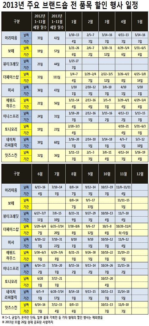 511일. 아리따움, 보떼, 뷰티크레딧, 더페이스샵, 미샤, 에뛰드하우스, 이니스프리, 토니모리, 네이처리퍼블릭, 잇츠스킨까지 주요 브랜드숍 10곳이 올해 1월부터 11월까지 실시한 전 품목 세일 행사일 수를 모두 합한 수치다.