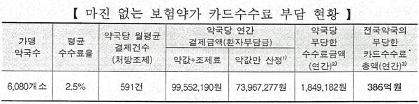 또, 평균 수수료 2.5%를 적용하면 약국 한 곳당 연간 평균 186만원의 수수료를 부담하고 있으며, 이를 전국 약국 2만 890곳으로 환산하면 연간 386억원의 카드수수료를 부당하게 지급하고 있다는 계산이 가능하다.