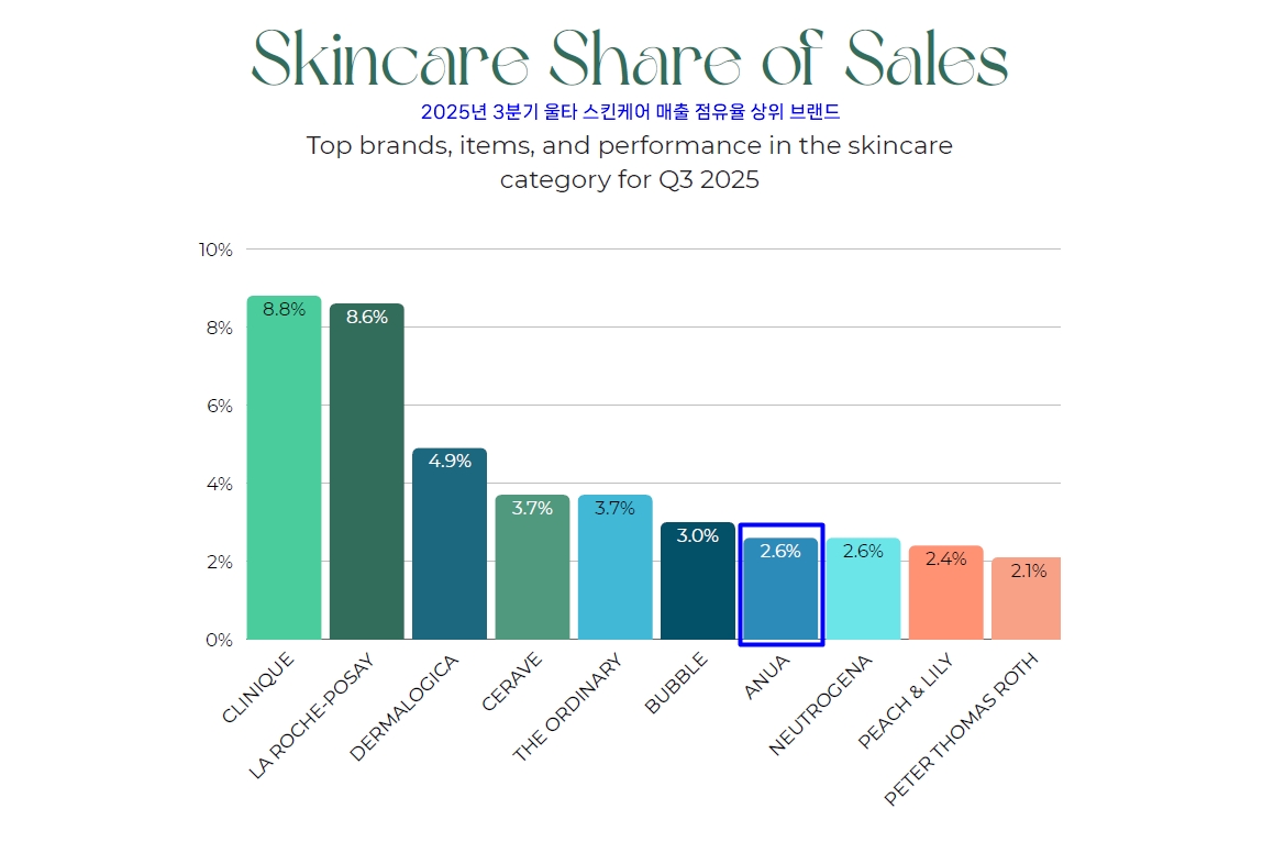 울타의 3분기 스킨케어 매출 점유율 상위 10개 브랜드는 △크리니크(Clinique) △라로슈포제(La Roche-Posay) △더말로지카(Dermalogica) △세라비(CeraVe) △디 오디너리 △버블(Bubble) △아누아(Anua) △뉴트로지나(Neutrogena) △피치앤릴리(Peach & Lily) △피터토마스로스(Peter Thomas Roth) 순으로 나타났다. 국내 브랜드는 아누아가 유일하게 순위권에 올랐다.