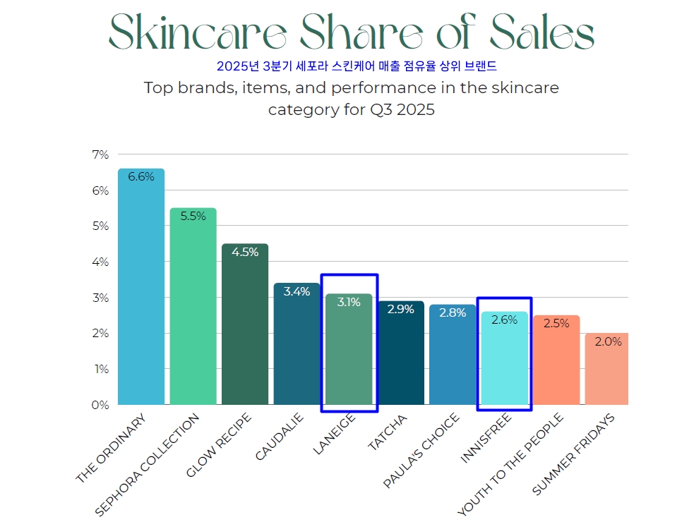 3분기 스킨케어 매출 점유율 상위 10개 브랜드는 △디 오디너리(The Ordinary, 6.6%) △세포라 컬렉션(Sephora Collection, 5.5%) △글로우레시피(Glow Recipe, 4.5%) △꼬달리(Caudalie, 3.4%) △라네즈(Laneige, 3.1%) △타차(Tatcha, 2.9%) △폴라초이스(Paula’s Choice, 2.8%) △이니스프리(Innisfree, 2.6%) △유스투더피플(Youth to the People, 2.5%) △서머프라이데이즈(Summer Fridays, 2.0%) 순이다.