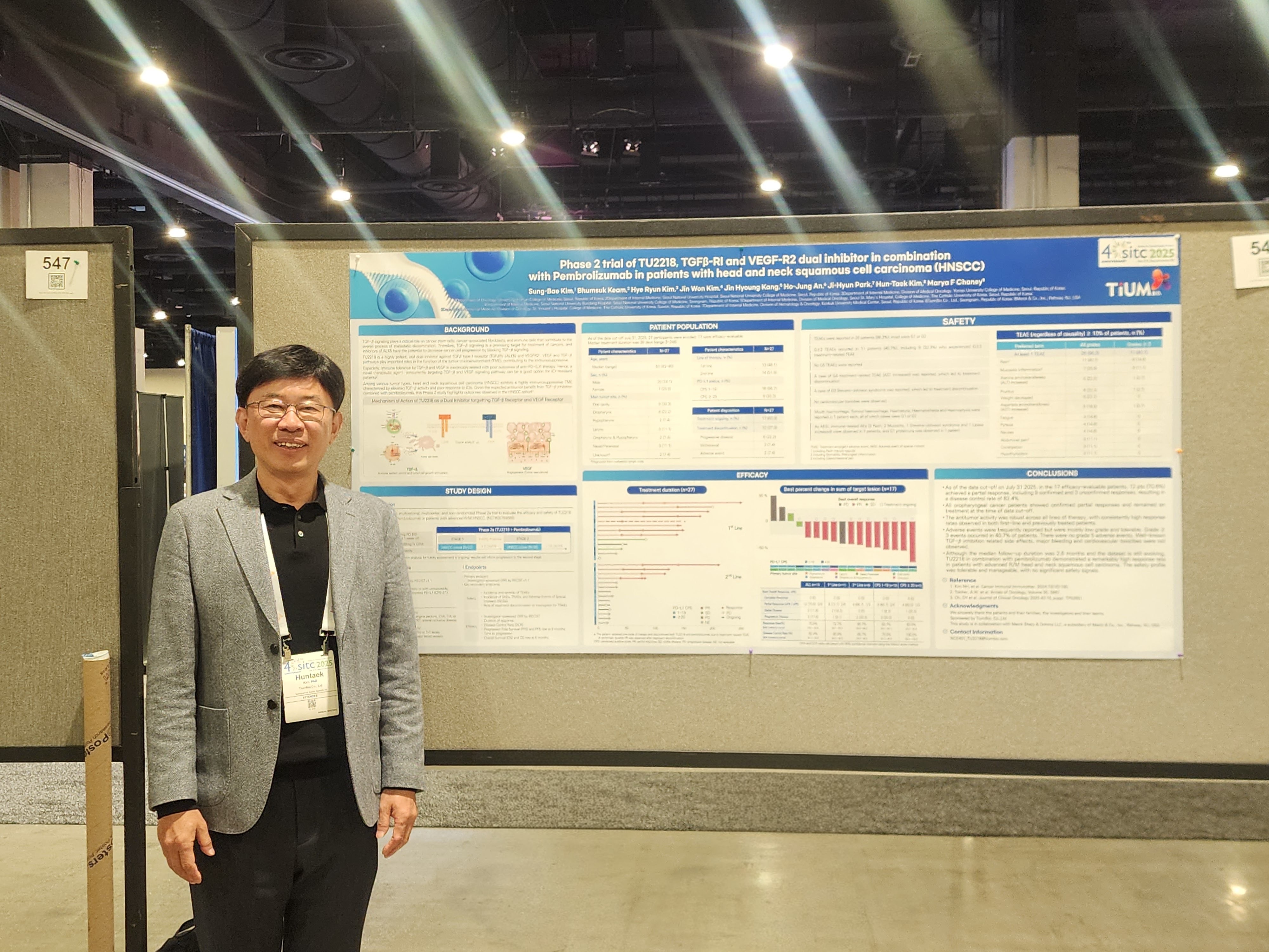 티움바이오 김훈택 대표는 “SITC 발표 결과는 초기 긍정적인 항암효과가 추가 임상 데이터와 후속 관찰에서도 지속되고 있음을 보여주는 고무적인 성과”라며 “TU2218과 키트루다 병용요법은 재발성·전이성 두경부암에서 기존 면역항암제 또는 면역항암제/화학요법 병용의 한계를 뛰어넘는 면역항암제로서 가능성과 가치를 보이고 있다”고 말했다.