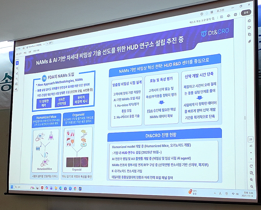 디티앤씨알오는 NAMs와 AI 기반 비임상 플랫폼을 갖춘 ‘HUD R&D 센터(Humanized & Organ-on-chip·Organoid-based Drug Development Center)’ 설립을 추진하고 있으며, 현재 셋업 작업을 진행 중이라고 밝혔다. NAMs 기반 기술과 기존 비임상시험을 결합한 ‘하이브리드 CRO’ 모델을 전면에 내세운 구상이다.