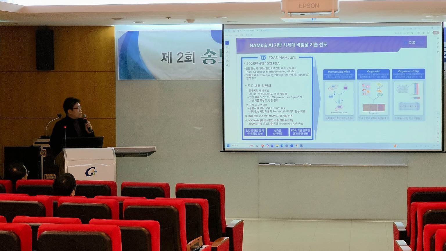 이 자리에서 디티앤씨알오 김석조 이사는 ‘Humanized(휴먼화)-Organoid(오가노이드)-AI(인공지능) 기반 비임상 전략’을 주제로 HUD R&D 센터 구축 방향과 하이브리드 CRO 모델을 발표했다.