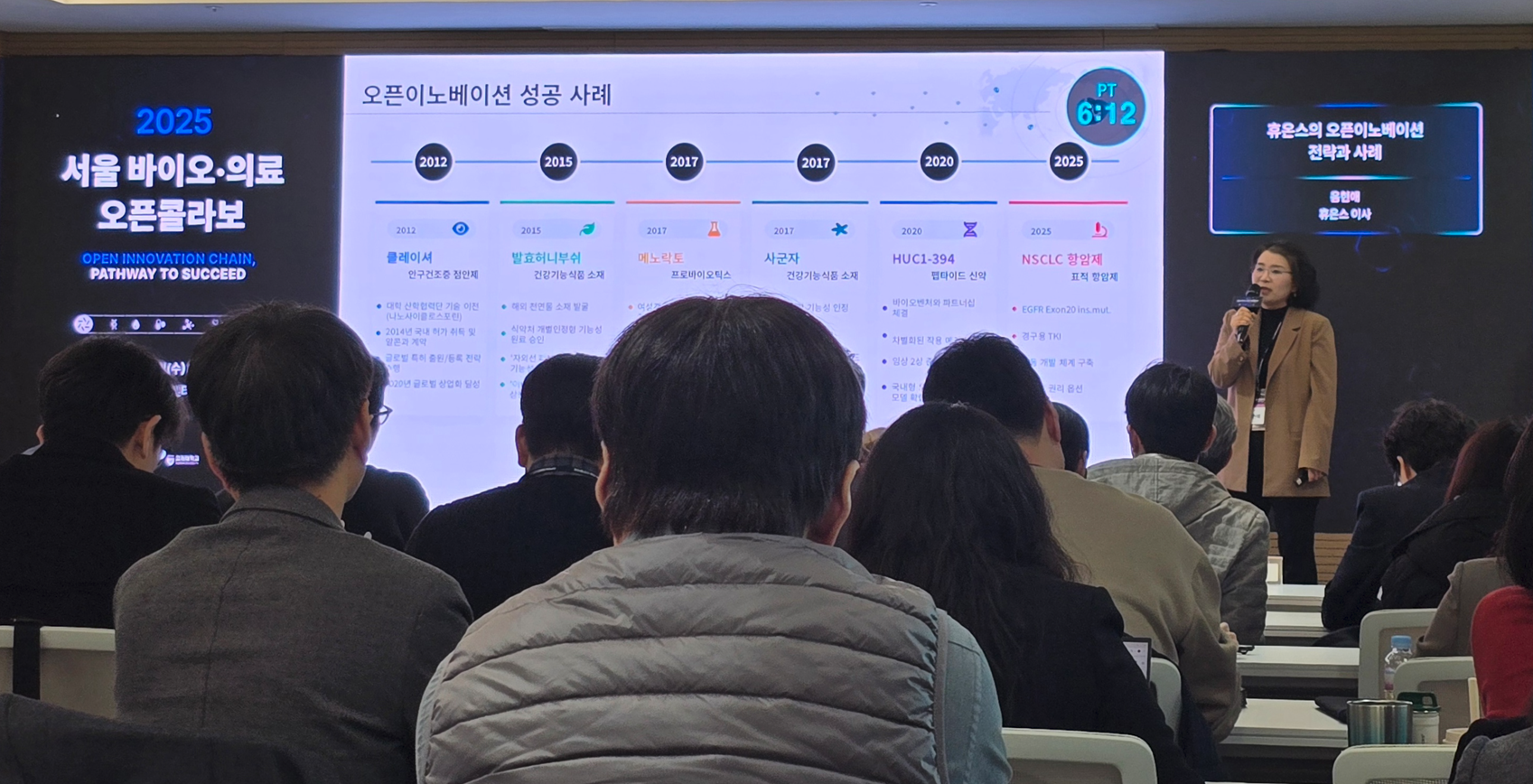 휴온스는 26일 서울바이오허브에서 열린 ‘2025 서울 바이오·의료 오픈콜라보’에서 회사의 오픈이노베이션 전략과 성과, 향후 기술 도입 방향을 소개했다.