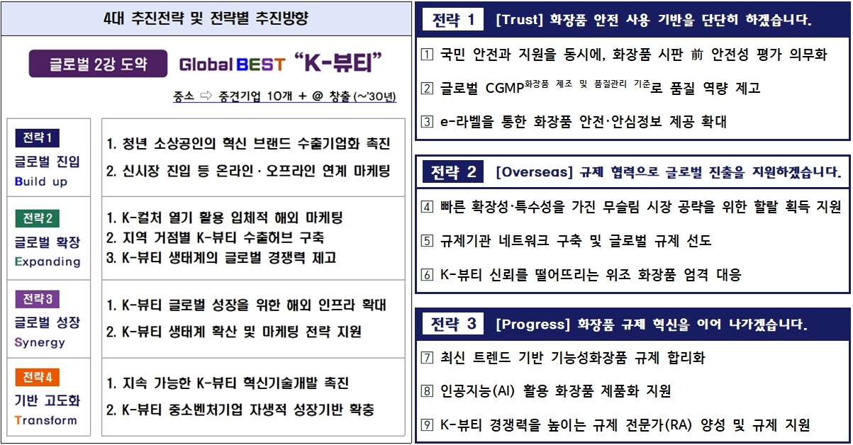 K-화장품의 글로벌 신뢰성을 제고하기 위해 △화장품 안전성 평가 제도 △e-라벨 표시 제도를 도입하기로 했다. 신시장 공략 가속화를 위해 △할랄 데이터베이스 마련 및 국제인증기관 간 상호인정을 추진하고 △위조화장품 유통 대처로 K-브랜드의 가치를 지켜내는 데도 힘쓸 계획이다.