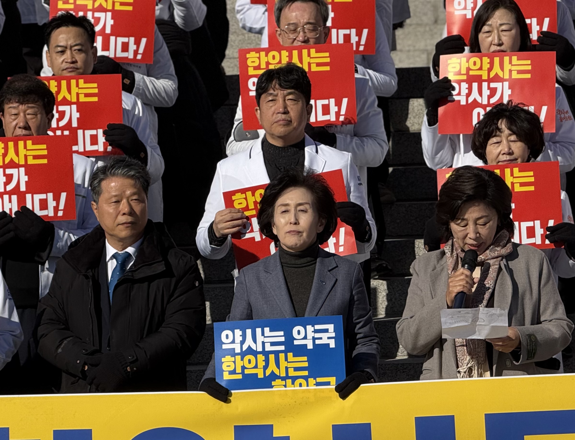 이날 약사법 개정 촉구 전국 임원 결의대회는 영하의 날씨에도 불구하고 전국에서 300여 명의 약사가 모인 가운데, 국회 보건복지위원회 소속 서영석 의원, 남인순 의원이 함께 참석했다.
