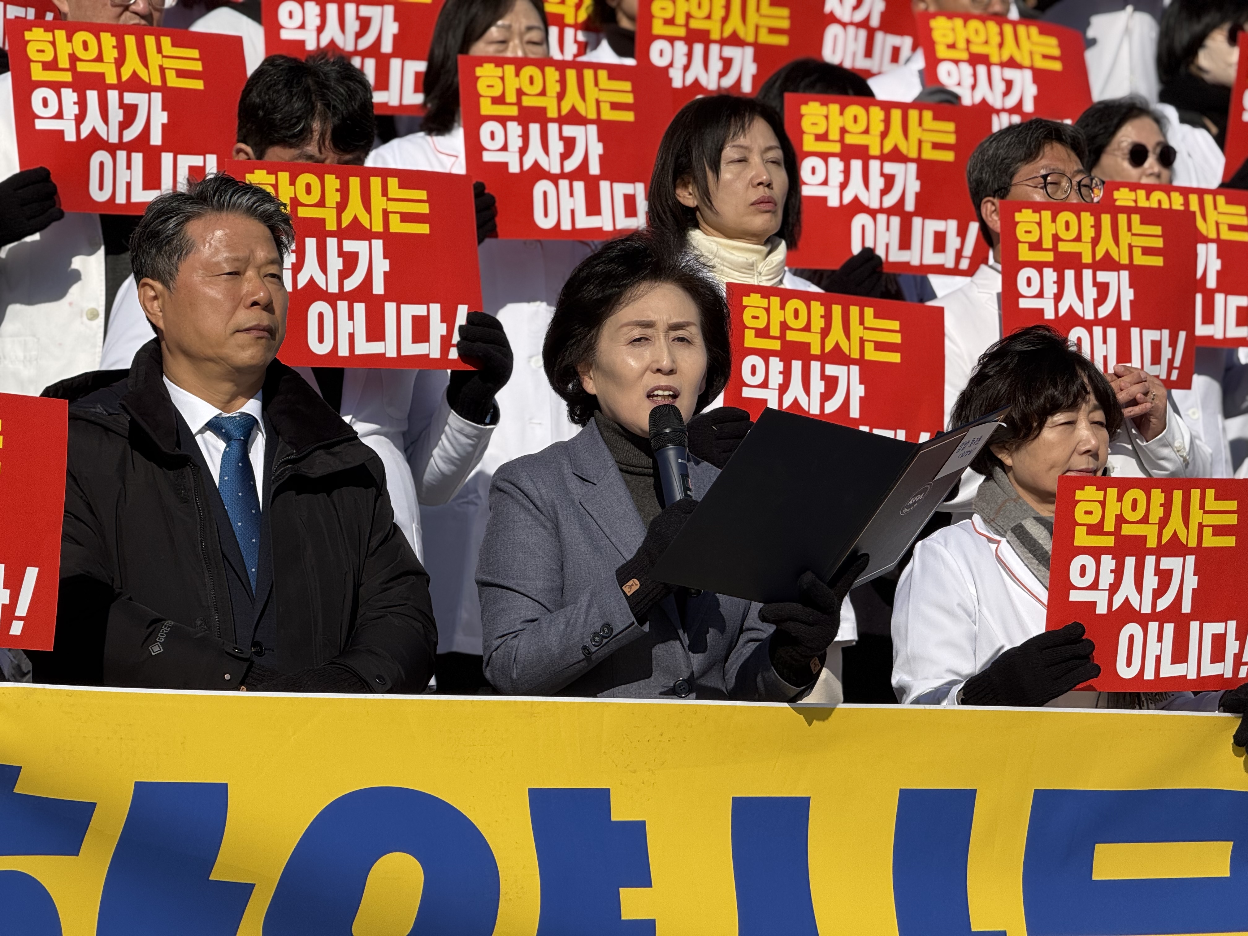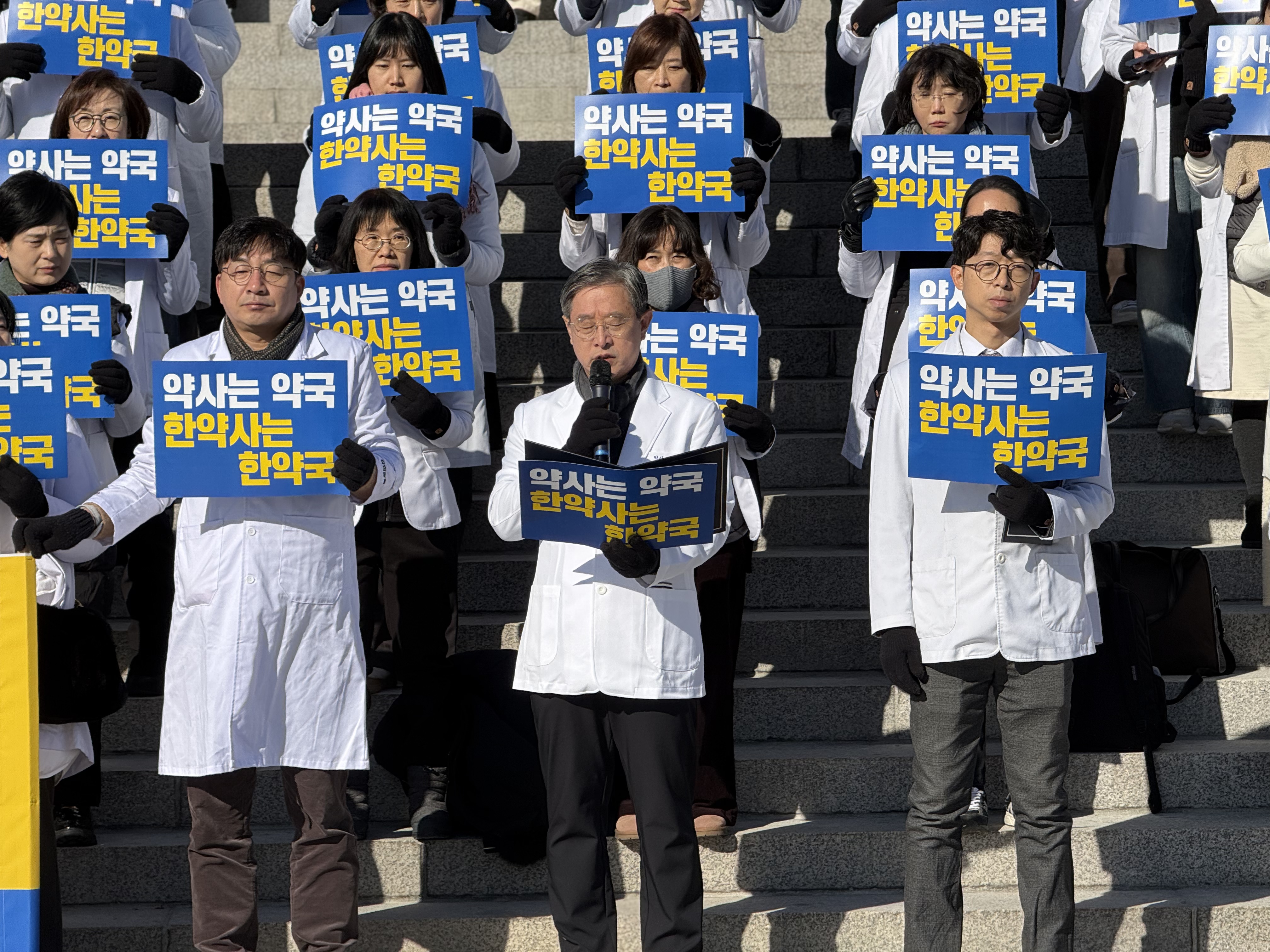 권영희 대한약사회 회장은 이날 "피를 토하는 심정으로 고한다"며, 약사와 한약사가 서로 다른 교육, 시험, 자격 과정을 거쳤음에도 불구하고 똑같은 이름의 약국을 개설할 수 있는 현행 제도의 부당함을 지적했다.