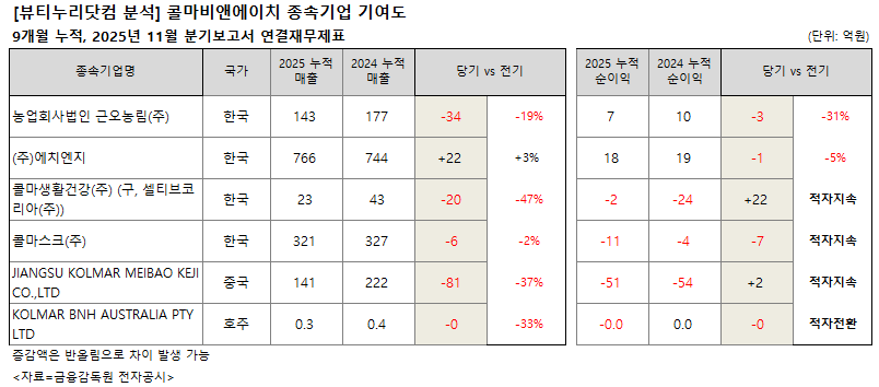 호주법인 KOLMAR BNH AUSTRALIA PTY LTD도 순손실을 기록하면서 적자전환했다. 매출은 3000만원으로 전년동기 4000만원 대비 33% 줄었다.