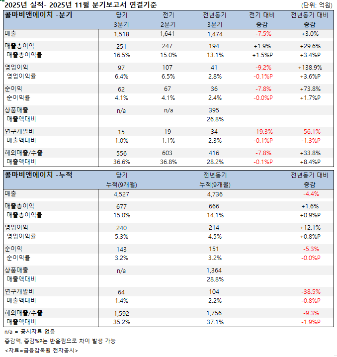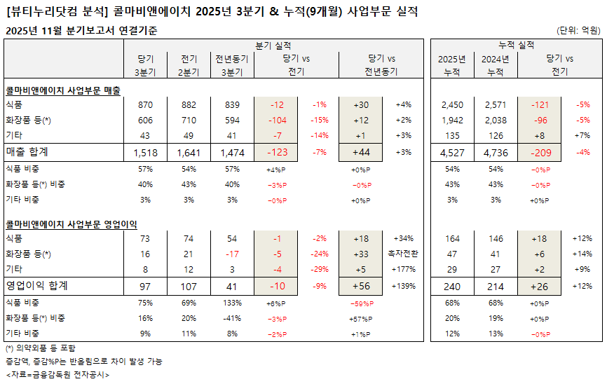 콜마비앤에이치는 올해 3분기 전기 대비 매출, 영업이익, 순이익이 모두 역성장했다. 다만 전년동기보다는 실적이 뚜렷하게 개선됐다.