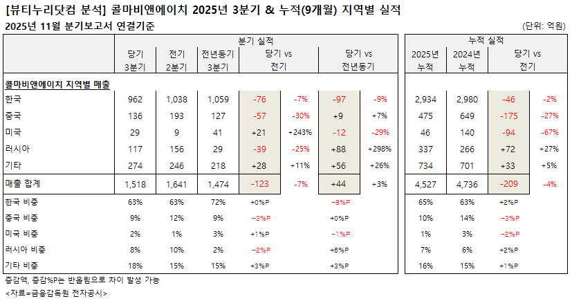 러시아 지역 3분기 매출은 117억원으로 전기 156억원 대비 25% 역성장했다. 전년동기 29억원보다는 298% 급증했다. 비중은 8%. 3분기 누적 매출은 337억원으로 전년동기 266억원 대비 27% 늘었다. 비중은 7%.