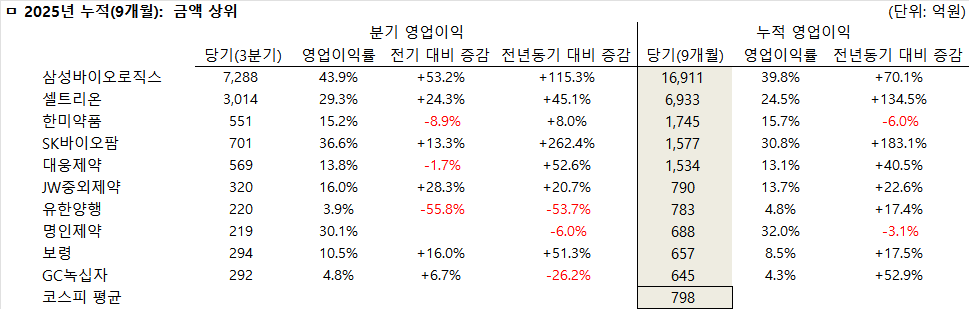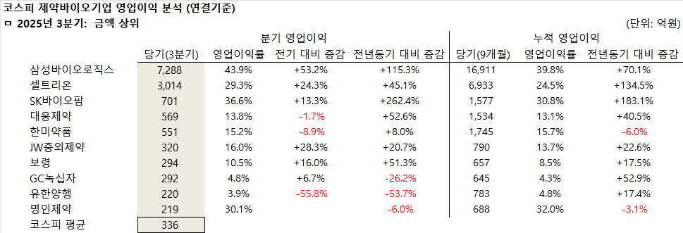 코스피 제약바이오기업 25년 3분기 영업이익을 살펴보면, 삼성바이오로직스와 셀트리온이라는 '투 톱(Two Top)'이 전체 이익을 견인하는 가운데, 기업 간 실적 양극화가 뚜렷하게 나타났다.