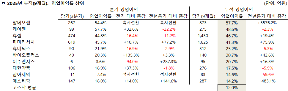 3분기 누적 기준 코스닥 제약바이오 기업들의 평균 영업이익률은 12.0%로 나타났다. 하지만 상위권, 특히 바이오 플랫폼 및 에스테틱 기업들은 40~50%대의 독보적인 고마진을 기록하며, 제조업 중심의 전통 제약사들과 확연히 다른 수익 구조를 입증했다.