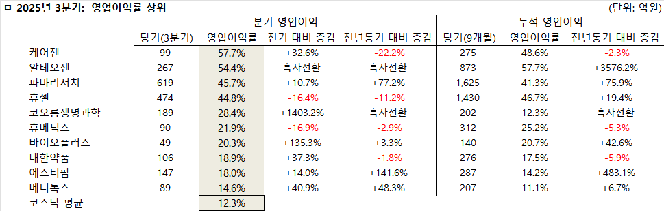 3분기 코스닥 제약바이오 기업들의 평균 영업이익률은 12.3%였으나, 상위권 기업들은 이보다 훨씬 높은 40~50%대의 초고수익성을 기록하며 압도적인 경쟁력을 보여주었다.
