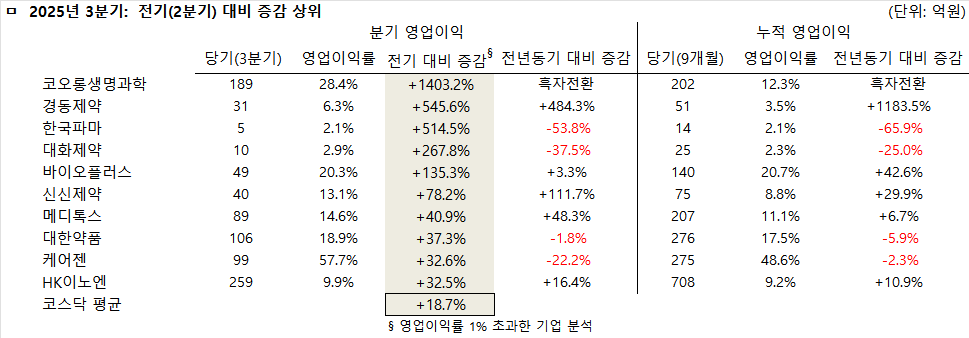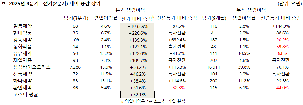 전기(2분기) 대비 증감 기준으로 살펴보면, 직전 분기(2분기) 대비 평균 32.1% 증가하며 전반적으로 수익성이 개선되는 흐름을 보였다. 특히 중견 제약사들의 이익 급증 현상이 두드러졌다.