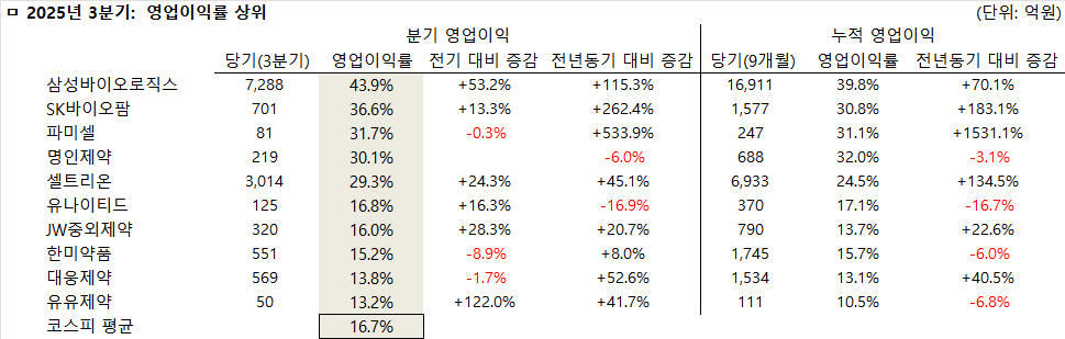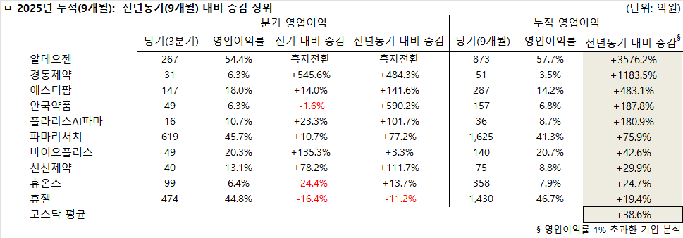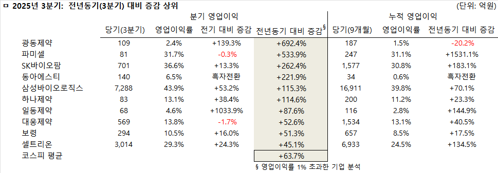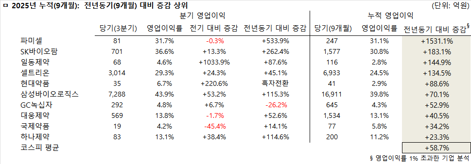 3분기 누적 코스피 제약바이오 기업들의 평균 영업이익 성장률은 58.7%로 매우 양호한 수준으로 나타났다. 특히 상위권 기업들은 기저효과를 넘어선 폭발적인 이익 성장으로 산업 전체의 수익성을 강력하게 견인했다.