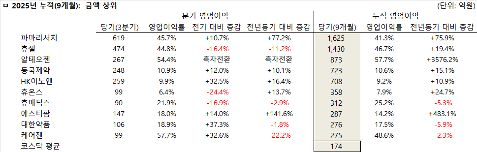 파마리서치는 3분기에만 619억 원의 영업이익을 기록하며 전체 1위를 차지했다. 이는 코스닥 평균(61억 원)의 10배가 넘는 수치이다. 이어 휴젤이 474억 원으로 2위를 기록했다.