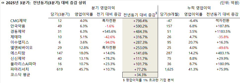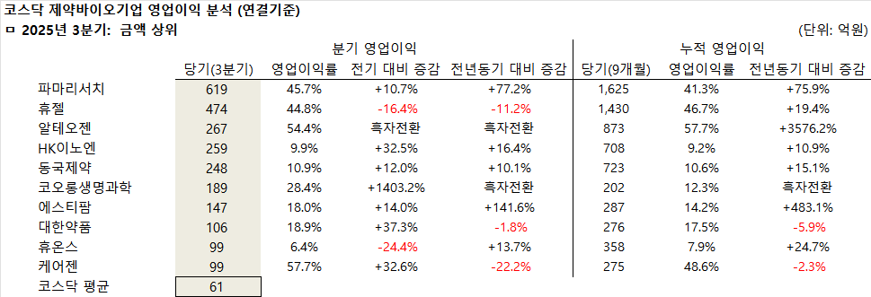 3분기 코스닥 제약바이오 기업들의 평균 영업이익은 61억 원에 불과했으나, 상위권 기업들은 이보다 수십 배에서 최대 100배에 달하는 막대한 이익을 창출하며 시장을 주도했다.