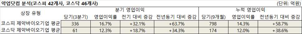 3분기 누적 영업이익 평균은 코스피 제약바이오기업 798억 원으로 전년동기 대비 58.7% 급증했고, 코스닥 제약바이오 기업 누적 영업이익 평균 174억 원을 기록하며, 전년동기 대비 38.6% 뚜렷한 성장세를 보였다.