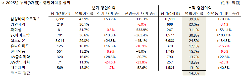올해 3분기까지의 누적 영업이익률을 살펴보면, 코스피 제약바이오 기업들의 3분기 누적 평균 영업이익률은 14.3%로 나타났다. 상위권 기업들은 이 평균을 2배 이상 상회하는 30~40%대의 초고수익 구조를 보여주며, 바이오 및 특정 분야 강소 제약사들의 수익성이 두드러졌다.