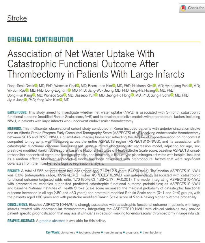 동국대학교 일산병원, 경북대병원, 계명대학교 동산병원, 분당서울대병원 연구진은 255명의 중증 뇌경색 환자를 분석한 결과, CT에서 측정된 NWU 수치가 높을수록 혈관 재개통 시술 이후 뇌부종·출혈 등 합병증 위험도 증가한다는 사실을 확인했다. 또한 NWU를 분석에 포함할 경우 예후 예측 정확도가 큰 폭으로 향상된다는 점도 밝혀냈다.