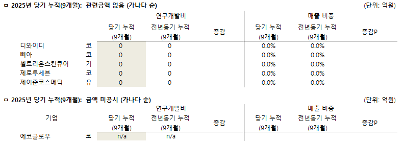 디와이디, 삐아, 셀트리온스킨큐어, 제로투세븐, 제이준코스메틱은 연구개발비 관련 지출이 '0'원으로 나타났다. 에코글로우는 연구개발비 금액을 공시하지 않았다.