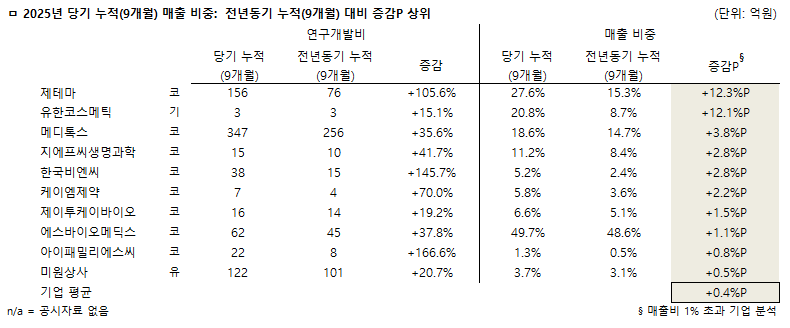 3분기 누적 기준 연구개발비가 매출액에서 차지하는 비중이 전년동기와 비교해 가장 가파르게 증가한 기업은 제테마다. 증가율은 12.3%p였다. 전년동기 15.3%에서 27.6%가 됐다.