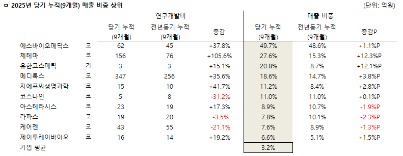6~10위는 코스나인(11.0%), 아스테라시스(8.9%), 라파스(7.8%), 케어젠(7.6%), 제이투케이바이오(6.6%)다. 80개 화장품기업 3분기 누적 기준 연구개발비 비중 평균은 3.2%다.