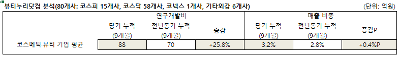 약업신문 자매지 화장품신문이 금융감독원 공시 2025년 11월 분기보고서(연결기준) 분석 결과, 화장품 관련 기업 80개사(코스피 15, 코스닥 58, 코넥스 1, 기타 외감 6)가 올해 3분기 누적 기준 연구개발비로 지출한 금액 평균은 88억원으로 집계됐다. 전년동기 70억원 대비 25.8% 증가한 규모다. 매출액 대비 연구개발비 비중은 3.2%로 전년동기 2.8% 대비 0.4%P 상승했다.