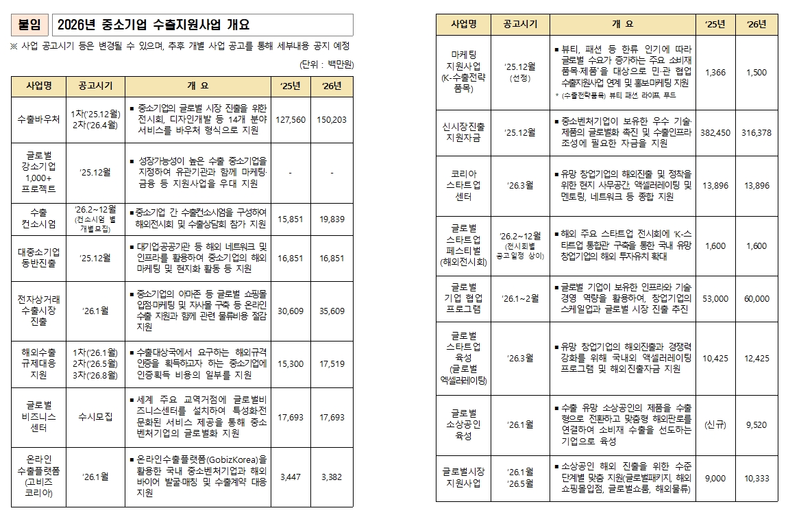 중기부는 10일 이 같은 내용을 담은 '2026년도 중소기업·창업·소상공인 수출지원사업 통합 공고'를 발표했다.