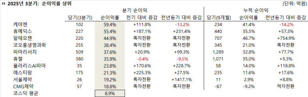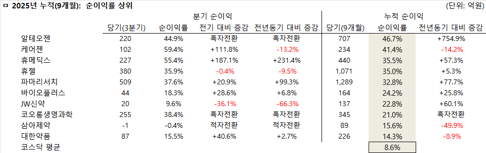코스닥 제약바이오 기업들의 3분기 누적 평균 순이익률은 8.6%로 나타났다. 그러나 상위 10개 기업은 이 평균을 2~5배 상회하는 고수익 구조를 갖추고 있다.