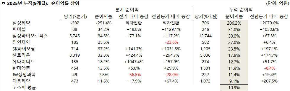 올해 3분기까지 코스피 제약바이오 기업들의 평균 누적 순이익률은 10.9%로 나타났다. 그러나 상위권 기업들은 이 평균을 훨씬 상회하는 수익성을 보여주었다.