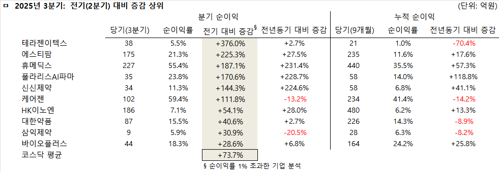 코스닥 제약바이오 기업들의 3분기 순이익은 전기 대비 평균 73.7% 증가했다. 전 분기의 부진을 씻어내는 강한 회복세와 특정 기업들의 폭발적인 이익 성장이 돋보이는 분기로 보여진다.