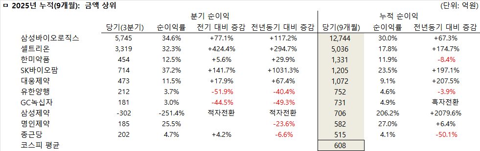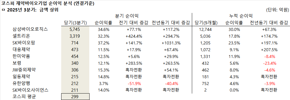 코스피 상장 기업의 올해 3분기 당기 순이익 규모 면에서 삼성바이오로직스와 셀트리온이 전체 평균(299억 원)을 크게 상회하며 시장을 주도하고 있다.