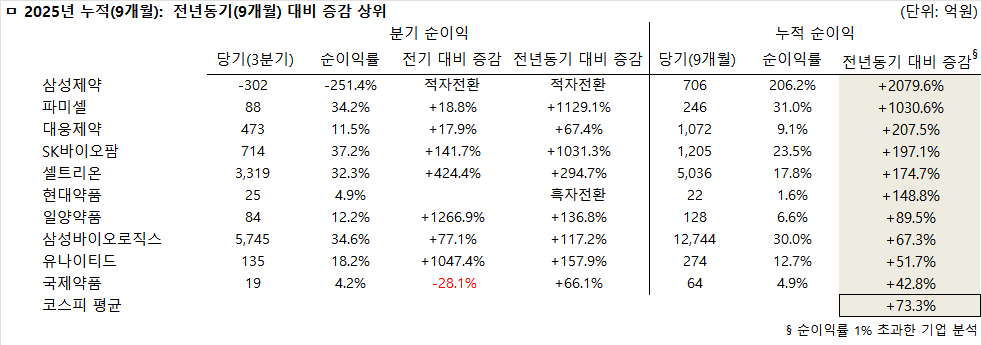 코스피 제약바이오 기업들의 3분기 누적 순이익은 전년 동기 대비 평균 73.3% 증가했다. 이는 상위권 기업들의 폭발적인 성장세가 전체 평균을 강력하게 견인한 결과로 분석된다.