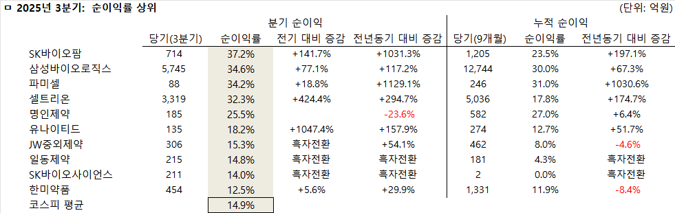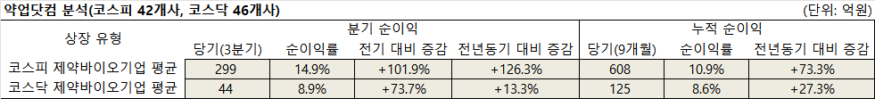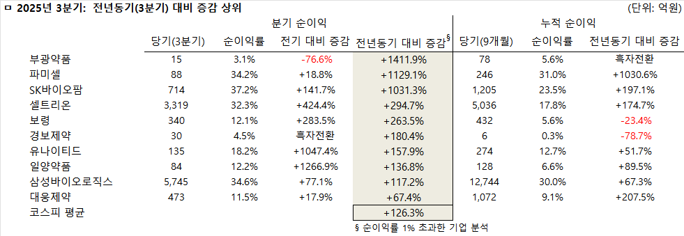 코스피 제약바이오 기업들의 3분기 순이익은 전년 동기 대비 평균 126.3% 증가했다. 이는 전년도의 기저효과와 더불어, 주요 바이오 기업들의 구조적인 이익 성장이 맞물린 결과로 분석된다.